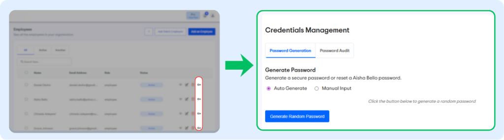 Previously, regenerating passwords manually for employees and guardians under credential management was difficult.